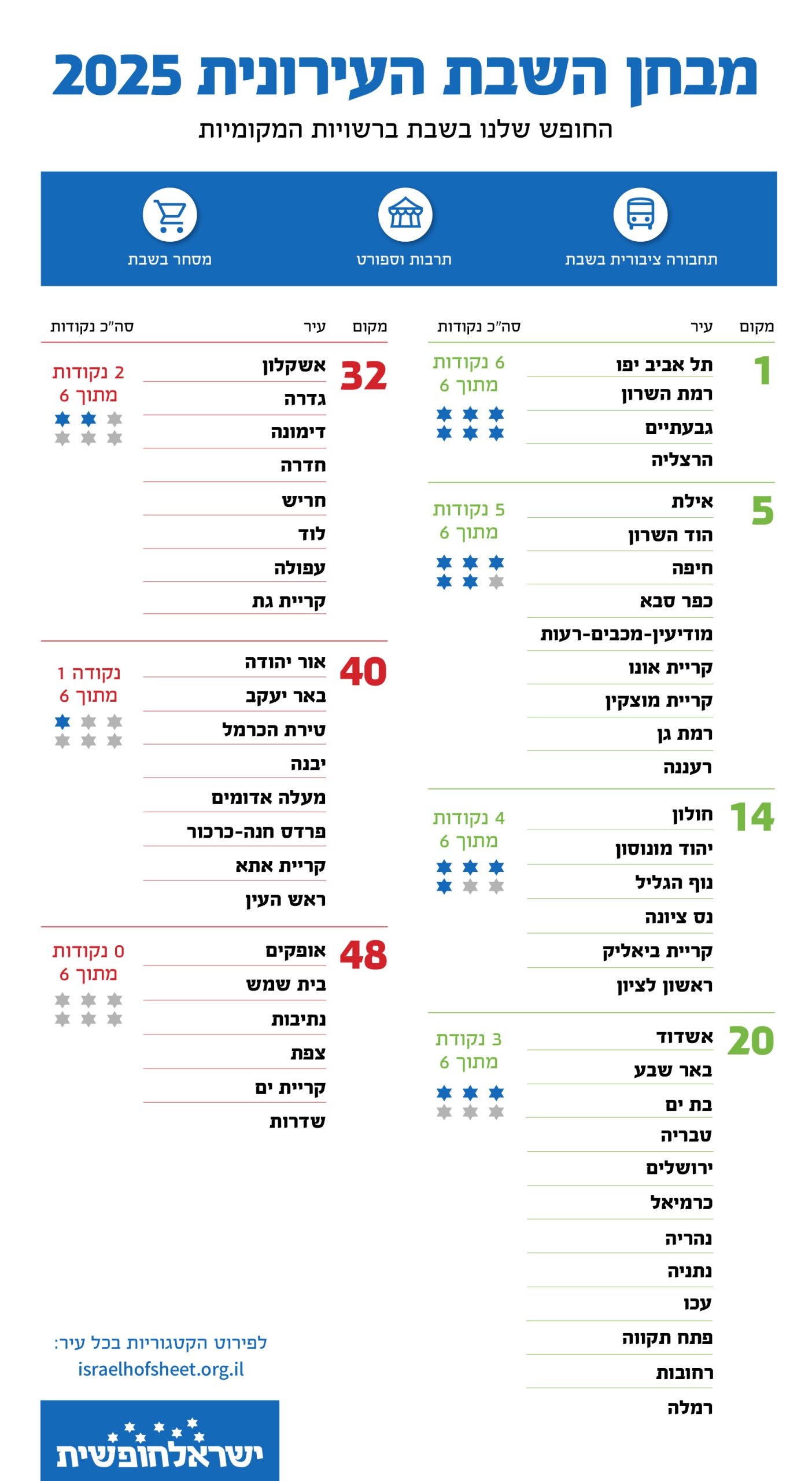 זו השנה השלישית שתנועת "ישראל חופשית" מפרסמת את מבחן השבת – דירוג שנתי שבוחן את מידת החופש בשבת ברחבי הארץ, מהערים הפתוחות ביותר בשבת ועד אלו שבהן כמעט ואין פעילות בסופי שבוע. מבחן השבת בדק השנה 53 רשויות מקומיות יהודיות (שאינן חרדיות), בפריסה גיאוגרפית נרחבת מצפון ועד דרום. המבחן בודק שלושה תחומים עיקריים: תחבורה ציבורית, מסחר, ופעילויות תרבות ופנאי בחסות העירייה. בתחום התחבורה, נבדק האם קיימת תחבורה עירונית ובין־עירונית בשבת בתמיכת הרשות המקומית. בתחום המסחר, נבחנה לא רק עצם הפעילות בפועל – כמו פתיחת מרכולים ומסעדות, אלא גם האם העירייה פעלה לשינוי חוקי העזר העירוניים כדי לאפשר אותה.