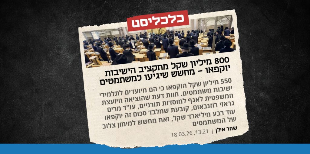 חוות דעת משפטית שפורסמה השבוע וחשף כלכליסט קובעת כי 800 מיליון שקל מתקציב הישיבות יוקפאו, בשל חשש שיגיעו למימון תלמידי ישיבות החייבים בגיוס. לפי הפרסום, מעבר ל־550 מיליון שקל שכבר הוקפאו, יוקפאו כעת עוד 250 מיליון שקל נוספים בשל חשש ל"מימון צולב" – מצב שבו כספים המיועדים לכאורה לתלמידים אחרים משמשים בפועל גם לתמיכה במשתמטים. […]